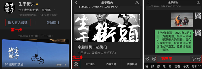 为方便更多用户参与,“生于街头”及“寻找城市之光”活动于2020年5月1日开通微博各自开通#生于街头# #寻找城市之光# 话题词投稿方式。6月1日起,活动投稿方式将变更为微博话题词投稿方式,原有的爱拍投稿通道将关闭,赛事其它规则不变。另外“生于街头”微信公众号也将于5月1日接收“生于街头”活动的用户投稿。具体投稿方法详见下文说明。