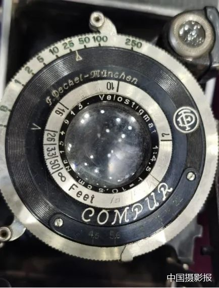 相机上最明显的字符是镜头外圈的“COMPUR”,通常译为“康帕”,是20世纪早中期德国的一种著名镜间快门。与“COMPUR”对称的字符是“F.Deckel-München”,这是生产康帕快门的公司名字。几个词结合起来表达的意思是F。德克尔在慕尼黑生产的康帕快门。镜头外围还有一个F。德克尔公司的logo,由公司创始人弗里德里希·德克尔(Friedrich Deckel)姓名的头两个字母“FD”组合而成。还有一个大写字母“V”,是F。德克尔公司于1928年开发出的V型康帕快门标志,该型号的快门拥有自动定时器,可用于自拍。