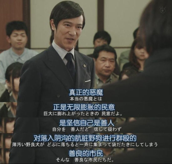 “民意就是对的,大家赞成的事全都是对的……要是民意想判一个人死刑,那就判吧,因为说到底这一系列官司,不过就是一场以绞死讨厌鬼为目的的国民运动,为了给自己无聊的人生消愁解闷的运动……如果民意可以决定一切,那就不需要这种拘泥于形式的建筑和郑重的手续,也不需要一脸傲慢的老头子和老太婆,下判决的绝不是国民的调查问卷,而是我国学识渊博的你们5位,请你们秉承作为司法顶尖人士的信念进行判断。拜托了!”——日剧《胜者即是正义》