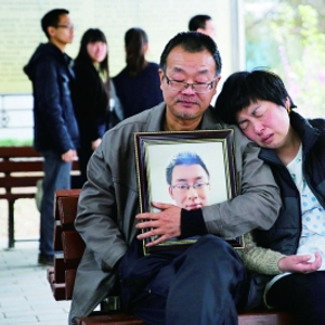 4月13日,陕西咸阳,告别仪式过后,则西的遗体被推去火化,父母坐在殡仪馆外等候。则西父亲说:“以后只有我们两个相依为命了。” 财新记者 万家/视觉中国