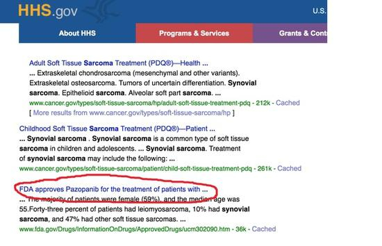 搜索结果中我们还能找到该疾病的最新治疗进展,“FDA批准帕唑帕尼用于治疗滑膜肉瘤”。