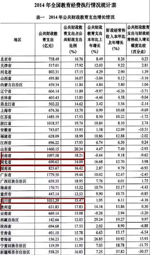 从教育支出占当年财政支出的比例而言,河南(18.21%)、湖南(16.42%)、四川(15.47%)、贵州(17.83%)也大于湖北(14%)……