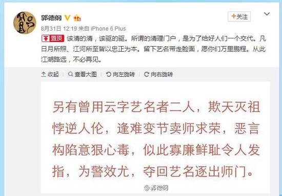 郭德纲微博发文称:“该清的清,该驱的驱。所谓的清理门户,是为了给好人们一个交代。凡日月所照、江河所至皆以忠正为本。留下艺名带走脸面,愿你们万里鹏程。从此江湖路远,不必再见。”在所配图片中,可见《家谱》上记载: