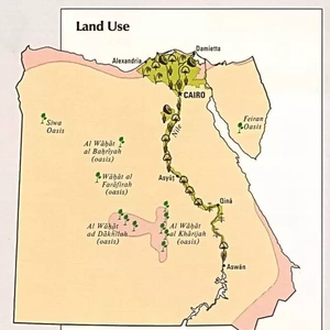 埃及的荒漠面积占国土面积的96%,随着耕地的日益稀缺,埃及政府开始开垦荒漠,扩大耕地面积。埃及所开垦的土地主要集中在尼罗河谷地和三角洲地区,因为这里有一定的水源供给,且需要投入的技术和资金较少。在扩大耕地方面,埃及已经取得了一定的成就。1960~1971年,埃及在三角洲的西部开垦了91.2万费丹(1费丹约合42公亩)的土地。1981~2004年,埃及进行了一场农业复兴,通过开垦荒漠使农业用地增加了220万费丹。埃及也正在实施荒漠变绿洲的计划,试图在2005~2017年,使绿洲面积由8.2亿费丹增加至11.4亿费丹。