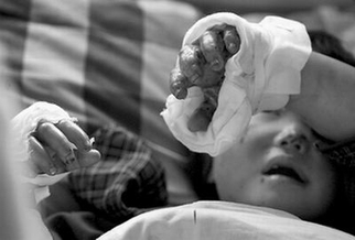 | 5岁小红躺在病床上,双手已经化脓感染 |