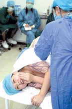 上午11时左右,记者才被允许进入手术室,但需要戴上医用帽子、口罩,穿鞋套、手术服,在进入手术室前也被院方要求只能站在规定地点,决不能接触任何手术器械。经过局部麻醉后的贾洁挥手向记者打起招呼。李教授表示在接下来9个小时的手术中,将在患者身体44处进行吸脂。眼看着长达十几厘米的特殊针头往女孩体内注入淡绿色的液体。