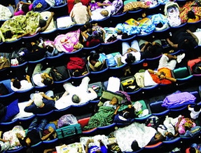 无法撤离的新奥尔良居民被集中安置,生活用品匮乏导致卫生条件恶化及犯罪率上升。