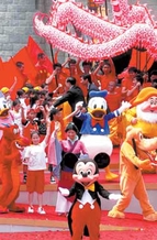 在富有中国传统特色的锣鼓声和威武的舞狮中,筹备6年之久、耗资294亿港元的迪士尼乐园于昨天上午11点40分正式开幕。