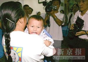 巍巍被养母抱着走出病房准备进行手术。巍巍有些害怕,吓得不停地哭。