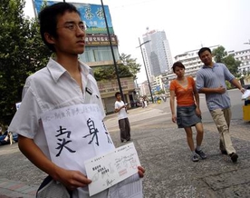 9月8日下午,一个胸前挂着“卖身契”的小伙子出现在华兴街口子上,顿时吸引了无数 市民围观。小伙子戴着一副眼镜,身穿白色短袖衬衣、黑色休闲裤,脚穿凉鞋,斜挎一小旅行包,胸前挂着一张白纸,用毛笔写着“卖身契”3个大字,上面还有一小行空心字:“大一新生筹学费,自愿卖身贵公司,学成回报。”