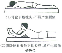 ▲俯卧位:采取此种体位睡觉的人很少。此种体位可按图示腹部垫枕头,防止腰部过度后伸,但应尽量避免采用。
