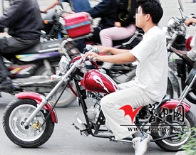 9月24日上午,记者在张店一大型超市一层的玩具专柜,看到了摆在最外边的一辆黑色“迷你摩托”。车身高约0.6米、长约1米,车轮直径大约0.3米,轮胎花纹粗大,排气筒紧靠着座位右侧,挡位、离合一应俱全,没有里程表和后视镜。老板介绍说,这种“迷你摩托”在美国十分畅销,不少孩子都骑着上学,最高时速在50公里左右,售价2800元。老板称,买这种摩托车的多是年轻人,虽然排气量和速度跟“小木兰”差不多,但样子时尚,而且又不用挂牌,还有的可以当作赛车玩,不少年轻人都是它的发烧友。如果在路上被警察逮住,就说是玩具,然后抱起来就能走,反正重量不到25公斤。
