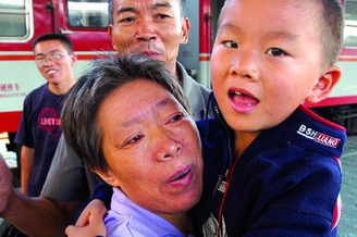 瓯海瞿溪妇女陈某伙同姘夫绑架7岁的儿子,向其前夫勒索十万元赎金。昨天,犯罪嫌疑人陈某和姘夫被瓯海警方从新疆押解回温。图为被解救的孩子回到奶奶的怀抱。记者郭大斌摄