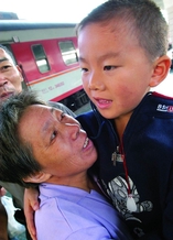 瓯海瞿溪妇女陈某伙同姘夫绑架7岁的儿子,向其前夫勒索十万元赎金。昨天,犯罪嫌疑人陈某和姘夫被瓯海警方从新疆押解回温。图为被解救的孩子回到奶奶的怀抱。记者郭大斌摄