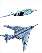 上图为Me P.1101/92重型战斗截击机项目。下图为Me P.1101/99终极攻击/驱逐机项目。