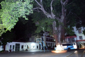 昨晚10时许,月光皎洁。巴金先生作品《电》中描写到的那两棵榕树,仍然在黎明大学旧校址旺盛地生长着。一走入黎大旧校址,也就是现在的泉州信息学院,一棵参天大树便跃入眼帘。大树恰好在学校操场的正中间,树干需要四个成年人才能环抱,有七八层楼那么高,另外一棵榕树则是在旁边的泉州市实验小学内,两棵榕树树龄都接近300岁,却依然枝繁叶茂,交相辉映,掩衬着两旁的教学楼。
