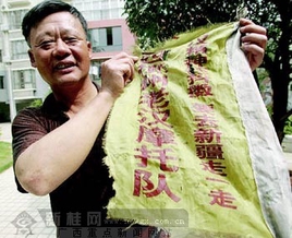 “老汉摩托队”走过了1.75万公里旅程归来,所带旗帜已残破不堪,“老汉精神还抖擞,要去新疆走一走”的标语却依然清晰。今报记者卿要林摄