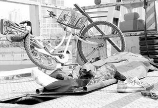拖车后面女子尸体被蓝布包裹,其所骑的自行车已严重变形。 时报记者周涛摄
