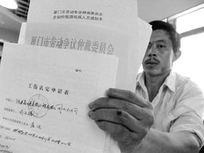 7月13日,厦门市劳动争议仲裁委员会受理了冯天福的申诉。冯说,按照受理通知书规定,他预交了仲裁费600元,加上之前的认定工伤、伤情鉴定等各种费用,他前后已交了近千元的维权成本。