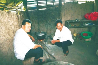 只见这个不足6平方米的“厨房”里,摆着一张饭桌———一块木板钉在四个埋在地上的木柱子上,一个破旧的课桌上面放着米、盐巴和一把洗好的白花菜(一种野菜)。教导主任符程庄正往围着三块石头垒起的灶里添木柴,校长符洪全正往铝锅里倒米。