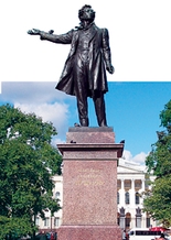 距驯马桥不远,是一座市内小公园,园内矗立着叶卡捷琳娜女王的全身像。女王手持权杖,目视前方,仪态威严,裙摆的下方围聚着昔日宠臣。有趣的是,这位显赫一时的女王并非俄国人,而是从德国嫁过来的媳妇。在雕像的身后是造型优美的亚历山大戏院,又名普希金戏院。1836年4月1日,果戈里的喜剧《钦差大臣》在此首映,而该剧的情节正是普希金向果戈里提供的。