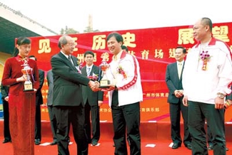 古广明(中)等广东足球名将昨天在越秀山体育场55周年志庆活动中获颁纪念品。本报记者廖艺摄