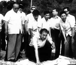 1981年4月,任仲夷(左五)视察广东梅县东山中学,与教职员工讨论教育问题。