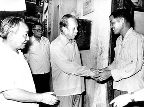 1982年5月20日,任仲夷(右二)和省长刘田夫看望灾区群众。