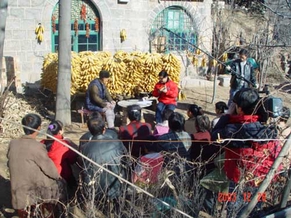 里安阳沟村是一个典型的小山村,两面山之间夹着东西散落着的窑洞,村头有一座由石头水泥砌成的大舞台,舞台两侧镌刻着:“到处莺歌燕舞,更有潺潺流水”,足以看出这座舞台是建于上个世纪七十代末期,同时也能看出在那个时候村里的文化生活是非常丰富的。在村中间,有一座看上好像是大礼堂的建筑,尽管整个建筑体已被风雨剥蚀的很不像样了,但其建筑规模上,绝非是村民投资能建起来的。史掌元就住在这个村子里,他介绍说,1960年,这个村被评为全国第一个文艺活动模范村,县里派人建了这座农民文化宫,当时他就带领大家在这里唱歌演出。现在这里已成了放杂物的仓库了。