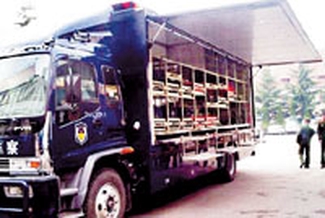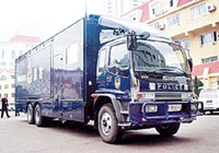 25日下午,警方一声令下,10余名武警跑到车前,车厢长达7米的两块侧板迅速向上打开。“整个车像一只展翅欲飞的大鸟!”武警拉下梯子,飞身上车,取防毒面具,手持防弹盾。整个过程不到1分钟!