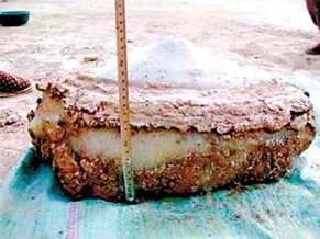 记者闻讯赶到江夏村。发现“太岁”的房屋地面很潮湿,“太岁”呈椭圆状,长约80厘米,宽约50厘米(见左图),工人们沿边缘挖进去20厘米仍未见底,看上去呈一个乌龟背一样压在黄土中间。它的表面已被工人用锄头挖进去了一半,房主李女士说,前天已经用簸箕搬走约3箕,但过了一个晚上,被挖走的部分竟自己复原。另外完整的一半表面呈灰色的硬角质,脚踏上去软绵绵,质感像是软糖。撕开表层硬角质,发现里面是金黄色如猪肉脂肪膏一样的物体,用手能将表层硬角质与金色脂膏撕开,撕开后发现金色脂膏内渗出黏液。细闻可闻到一股新鲜的土味。