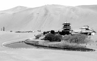 月牙泉被认为是敦煌的眼睛,也是大漠深处最具特色的景点之一。月牙泉位于敦煌市南5公里处,其形状酷似一弯新月,四面被鸣沙山环抱,“沙水共生、山泉共处”,从而构成了举世闻名的沙漠奇观。但由于近年来敦煌生态恶化导致月牙泉水位急剧下降,截至目前,月牙泉的水位仅有1米。
