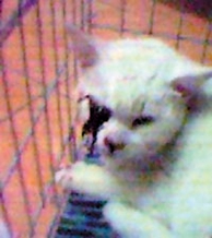 宿舍内的场景让在场所有的人都惊呆了,地面刚刚被拖干净,但摆放猫的笼子里则鲜血一片。刚才还是生灵活现的猫正萎缩在笼子边,一只眼珠不见了,只留下个黑色的、鲜血直流的大窟窿。可能是流血过多,白猫已经无力叫唤,只是痛苦地呻吟着。