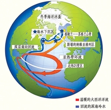 右侧的图片是大西洋洋流循环示意图。如图所示,在中大西洋,按顺时针方向旋转的环流中会分出一支洋流向北运动,当这个支流运动到挪威附近海域后,其温暖的海水已冷却下来,由于温度太低,这股海流开始下沉,然后向南回流,回到赤道以南的地区后又被加热,进而推动温暖的洋流再向高纬度的北方流动,所以这股洋流会源源不断地把热量带到北大西洋地区,使得中、西欧地区有着温和的气候条件。