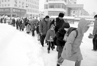 12月4日下午5时,山东威海市初张路上积雪深达30多厘米。一辆从上海来的客车在一个前不着村后不着店的地方抛了锚。车上有20多名乘客,其中包括孕妇、老人和儿童。风雪越来越紧,随着夜幕降临,气温不断下降,孩子们冻得直哭。全车人只能一边挤在一起取暖,一边等待救援。直到深夜12时,警察和救援的队伍赶到现场,给手脚冻僵的人们送来了大衣和热米汤。
