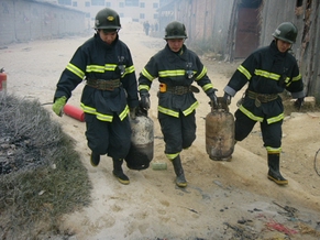 12月12日9时许,惠安县惠南工业区一建筑工棚发生火灾,消防队员从火中抢出9个液化气瓶。