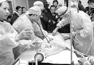 本报讯(实习记者 余文龙)一头成年白?鹿异常消瘦,体重大约只有30公斤,成都市动物园怀疑其胃中有塑料袋,昨日上午,外籍兽医苏保罗给鹿动手术,在其胃上切开约10厘米的口子探查,约一个半小时的手术结束后,没有在鹿的胃里发现大块异物。动物园将为鹿查找消瘦的其他原因。