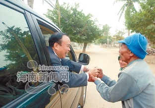 12月14日,黄成模(左)来到东方市八所镇新北村77岁贫困老党员林瑞保家里慰问,离开时,林瑞保依依不舍紧紧握住书记的双手。 林瑞保常年有病,生活困难,一直住在低矮破旧的瓦房里,是黄成模的帮扶对子之一。2003年10月,黄成模从自己工资里拿出500元,并发动有关单位捐款,为他修建了一间40多平方米的平顶房。 本报记者 李英挺