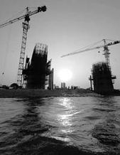 12月22日,广州珠江大濠沙岛上,珠江黄埔大桥北汊斜拉桥巨大的主塔已高出水面20多米。该桥是独塔双索面钢箱梁斜拉桥,主跨383米、主塔高度226.14米,全桥由斜索拉起50段钢箱梁,总重达13371吨。该桥建成之后,将会夺得世界上同类型桥梁中跨度最大、主塔高度最高的两项冠军。