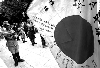 日本老兵在靖国神社外高举日本军旗