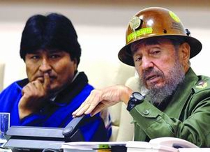 玻利维亚当选总统莫拉莱斯2005年12月30日访问古巴与卡斯特罗在一起。