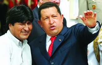 据拉丁美洲通讯社报道,玻利维亚当选总统莫拉莱斯对前来机场欢迎的委内瑞拉总统查韦斯予以军人的敬礼和微笑拥抱。莫拉莱斯在机场发表讲话称:“我们已加入反帝国主义的战斗。这是个新的时代,我们要为我们的人民谋取福利,而不是为某些帝国。”在首都加拉加斯宫殿举行会谈后,两位领导人还向委内瑞拉印第安人英雄墓献花。