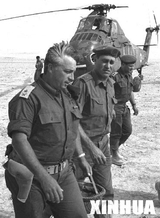 1967年6月1日,时任少将的沙龙(前左)在以色列内盖夫沙漠与加维什少将交谈的资料照片。