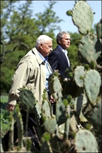 在美国得克萨斯州克劳福德农场,美国总统布什(右)与到访的以色列总理沙龙准备出席新闻发布会。资料图片