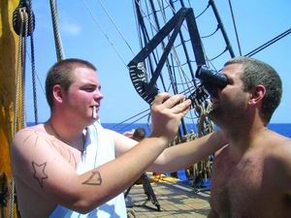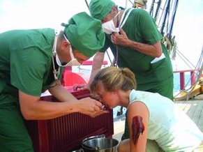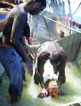 我和老沈由于要拍摄洗礼全过程,因此前天已经向船长打好招呼,希望把我们的洗礼安排得尽量靠前。果然,大家刚刚在炮舱里坐下,“警察”就下来提老沈和我了。一爬上后甲板,“警察”便责令我们四脚着地爬到前甲板,然后登上小平台去面见船长。船长说:“很高兴见到你们,现在,请亲吻我夫人的小腿吧。”船上的总工程师“男扮女装”摇身一变成为船长夫人,坐在船长身边,两条小腿涂满了巧克力色的东西,发出一股呛人的味道。
