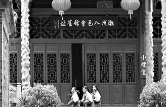 下课了,三个女生从真光中学内的潮州八邑会馆前跑过。倪黎祥摄