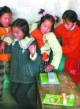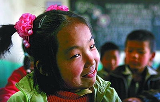 同行的另一位同事在红艳去北京前曾采访过她,“那时,她对人爱理不理,不怎么说话,有时还显得很烦躁。”这次再见到红艳,他惊奇地发现,红艳对采访很配合,脸上还有了笑容(图4),“变开朗了”。红艳的变化,也被她的同桌——班长刘嘉伟发现了。“她以前不怎么和我说话,现在不会了。”当记者问刘嘉伟:“你们相处愉快吗?”一旁的红艳羞涩地笑着用手蒙住了脸,眼睛透过指缝看着同桌,“愉快。我会借童话书给她看,还会讲笑话,其实她很爱笑的。”刘嘉伟说。