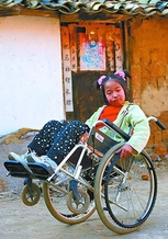 我们的出现,在孩子里面引起了一阵骚动:他们兴奋地凑到照相机前闹个不停。如果没有放在讲台旁的轮椅(图2),没有人会觉出这个班上有个特别的孩子。在孩子们的指点下,记者看见了坐在第一排的小红艳,脸色比半年前好了不少,桌下的“双脚”并没有和别人有什么不同。与周围兴奋的孩子相比,红艳显得很镇定,她看了看记者,便继续埋头写作业。
