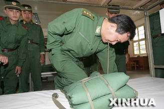 独臂英雄丁晓兵为战士示范打背包的技巧。新华社记者李刚摄