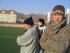 上个月的一天下午,青岛很冷,我们部门一记者突然给我打电话,说中能队在青岛大学和他们校队打比赛,宿茂臻在现场和殷铁生在一起,我以为他在骗我,因为前一天我们在MSN上聊天时他还在英国。我这同事将电话交给了茂臻,电话中他说这次是临时决定来送父母回青岛的,明天马上回去,所以谁也没告诉。听说殷导在这打比赛,就赶过来看看。晚上同事拍回来照片(就是文上面那个),您看看还是印象中的宿茂臻吗?